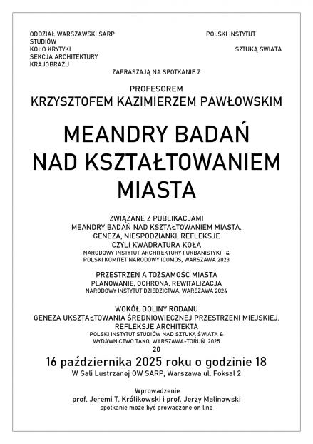 W imieniu Polskiego Instytutu Studiów nad Sztuką Świata i oraz oddziału warszawskiego SARP zapraszamy na spotkanie z profesorem Krzysztofem K. Pawłowskim, na którym będą dostępne także jego publikacje. Spotkanie odbędzie się czwartek, 16 października 2025 o godzinie 18 w Sali Lustrzanej OW SARP w Warszawie przy ul. Foksal 2.