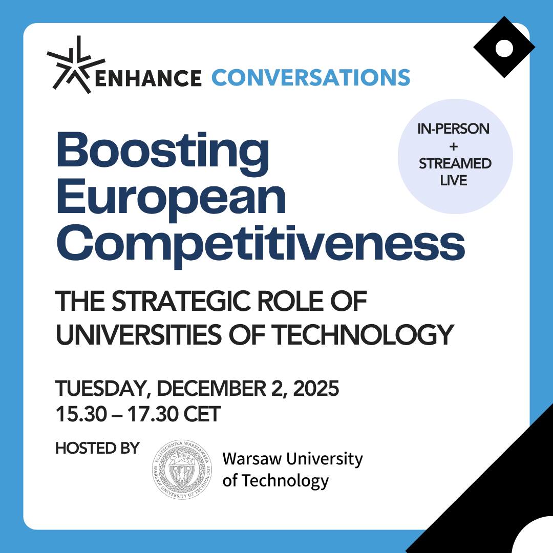 Zapraszamy na interdyscyplinarną dyskusję panelową ENHANCE Conversations 2025. Jest to wyjątkowe wydarzenie współorganizowane przez Politechnikę Warszawską jako uczelnię partnerską konsorcjum ENHANCE. Wydarzenie odbędzie się 2 grudnia w godz. 15:30-17:30 w Małej Auli Politechniki Warszawskiej. Dostępna będzie również transmisja live.