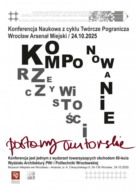 Zapraszamy do udziału w konferencji naukowej pt. Komponowanie rzeczywistości / Postawy autorskie.Konferencja odbędzie się 24 października 2025 we Wrocławiu i będzie poświęcona kompozycji – rozumianej w wymiarze artystycznym, architektonicznym i społecznym – jako zagadnieniu historycznemu, współczesnemu i aktualnemu wobec wyzwań cyfrowej rzeczywistości. Wydarzenie adresowane jest do twórców, teoretyków, dydaktyków oraz doktorantów zainteresowanych problematyką kompozycji w sztuce i architekturze.